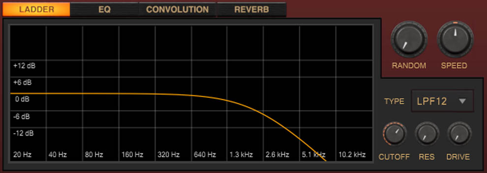 You can apply various effects like a ladder filter, EQ, convolution or reverb. This can be applied at both, the bus level as well as at the global level. To edit an effect, click on the instance in the bus section or the global section and you will be able to see its respective parameters.